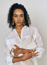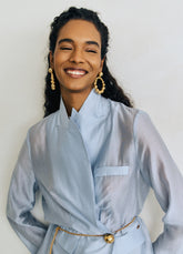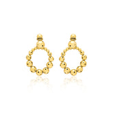 CON UN DISEÑO QUE FLUYE ENTRE LO SIMBÓLICO Y LO CONTEMPORÁNEO, ESTOS ARETES METÁLICOS BAÑADOS EN ORO DE 24K DESTACAN POR SU GEOMETRÍA ORGÁNICA Y SU ESTRUCTURA. LAS ESFERAS PERFORADAS EN PROGRESIÓN DE TAMAÑO CREAN UN SUTIL RITMO VISUAL, MIENTRAS SU TEXTURA ARTESANAL EVOCA UNA IDENTIDAD AUTÉNTICA Y CON CARÁCTER.