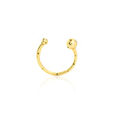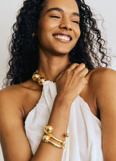 UNA PIEZA QUE EVOCA LO ESENCIAL CON FUERZA SIMBÓLICA. ESTE BRAZALETE METÁLICO, BAÑADO EN ORO DE 24K, COMBINA MINIMALISMO RÚSTICO CON UN DISEÑO VERSÁTIL Y CONTEMPORÁNEO. LAS ESFERAS DECORATIVAS ASIMÉTRICAS Y LOS CALADOS ARTESANALES DESTACAN UNA CONSTRUCCIÓN SÓLIDA Y DETALLADA. SU SISTEMA DE APERTURA PERMITE LLEVARLO TAMBIÉN COMO ACCESORIO DE BOLSO, AÑADIENDO UNA FUNCIONALIDAD SUTIL Y ELEGANTE.