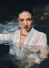 ESTE CHOKER LIVIANO, BAÑADO EN ORO DE 24K, DESTACA POR SU VOLUMEN ESCULTURAL Y UNA ESTÉTICA QUE MEZCLA MINIMALISMO RÚSTICO CON VANGUARDIA. LAS ESFERAS ASIMÉTRICAS Y LOS CALADOS DECORATIVOS APORTAN CARÁCTER Y AUTENTICIDAD. VERSÁTIL Y CONTEMPORÁNEO, PUEDE USARSE TAMBIÉN COMO ACCESORIO EN BOLSOS O VESTIDOS, LLEVANDO CONSIGO UNA INTENCIÓN SIMBÓLICA LLENA DE FUERZA.